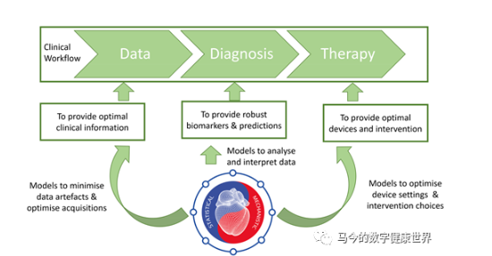 精准心脏病学将利用从数据中学习到的统计模型,通过多维度知识和数据集成的机械建模和仿真进行演绎,模型包含了生理学知识以及物理和化学的基本定律,提供一个整合和扩充实验和临床数据的框架,即使在看不见的情况下,也能够确定机制和/或预测结果。应用于计算心脏病学的统计模型的例子是用于评估心力衰竭严重程度的随机森林或高斯过程以捕捉心率变异性。