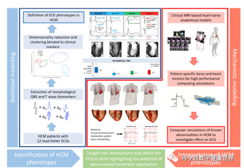 例如,模型协同是一种令人兴奋的方法,用于解释结构-功能关系,并改善遗传性疾病的风险预测。如肥厚性心肌病(HCM).从观察中推断出特定ECG改变、心室形态和心源性猝死之间的关系。然而,将HCM中潜在的异质性基质转化为ECG结果的复杂过程仍然知之甚少。在低危患者亚组中存在临床决策的"灰色地带",特别是在决定限制参与职业运动时。在这方面,通过使用统计推断和数学建模方法,根据从24小时ECG记录中提取的ECG生物标志物对HCM患者进行表型分类,各ECG表型的病因学与不同的基础底物有关,提示存在离子通道和传导系统异常。该结果直接强调了个性化抗心律失常方法在治疗肥厚型心肌病患者中的潜力,并对低危患者进行处理。