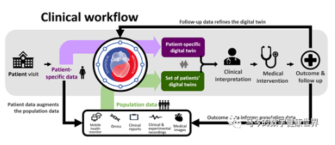 使用充分发展的数字孪生概念预想临床工作流程,从以前患者和研究队列收集的人口数据用于创建和验证统计和机械模型,以及创建基于人口的数字孪生(绿色),在现有模型的帮助下分析新的患者数据,并将其集成以形成患者的数字孪生(紫色)。数字孪生之间的比较和相互作用提供了有价值的见解(表型,风险评估,疾病发展的预测等),临床解释结合传统的数据,以帮助临床决策。数字孪生随病情发展,随随访数据调整完善。所产生的结果得到补充,以形成人口数据并完善后续数据。
