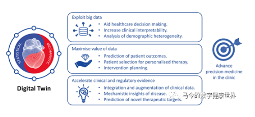 目前仍处于零散和初期阶段的"数字孪生"概念将在未来5至10年内逐步具体化并得到采纳。数字孪生的整体整合是一种愿望,将通过两种互补和协同的途径来实现:第一种途径是心脏疾病管理中关键决策点的细化,由个性化的机械模型驱动,这些模型由患者的关键数据片段提供信息;第二是以疾病为中心,优化患者在医疗保健系统中的生命旅程,由大量人口的电子健康记录告知的统计模型驱动。