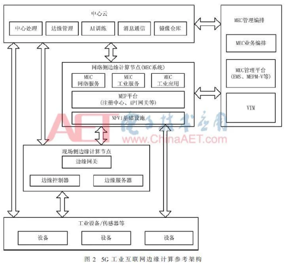 (1)云:包括中心云服务、集中化的MEC管理编排系统,中心云服务包括边缘计算节点的管理以及为边缘应用与服务提供云端的后台服务,包括设备管理、AI训练、云端存储、镜像仓库等。