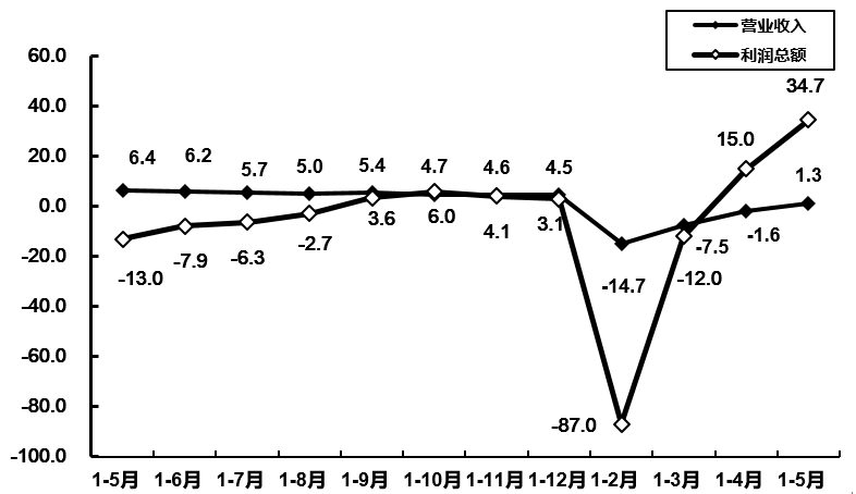 1-5月,通信设备制造业营业收入同比下降0.5%,利润同比增长70.3%。