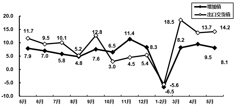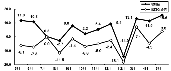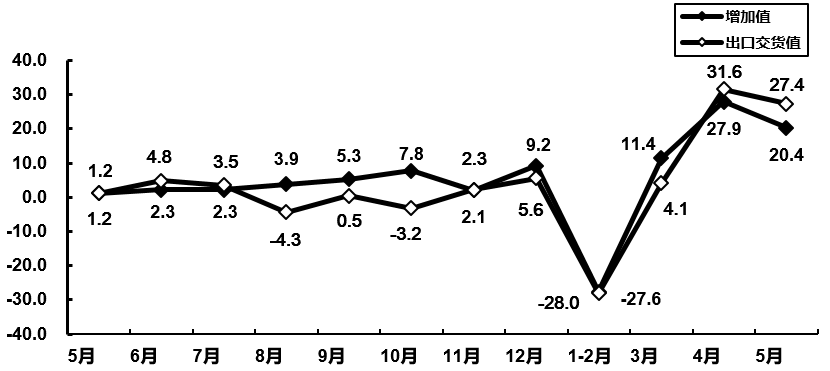 图1 2020年5月电子信息制造业增加值和出口交货值分月增速(%)