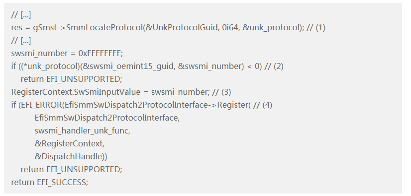 4.最后,EFI_SMM_SW_DISPATCH2_PROTOCOL用于将函数注册swsmi_handler_unk_func为SWSMI处理程序。