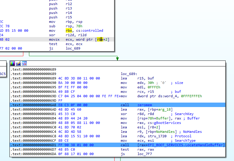 要做的第一件事是检查at的值*(controlled+2)是否为0,如果是这种情况,它将经过一些奇怪的事情(这的确是0xFFFEFFFE在该地址的写操作,0x4因为我们在物理内存中没有任何保护)这不会造成崩溃,请调用该 EFI_BOOT_SERVICES.LocateHandleBuffer函数。