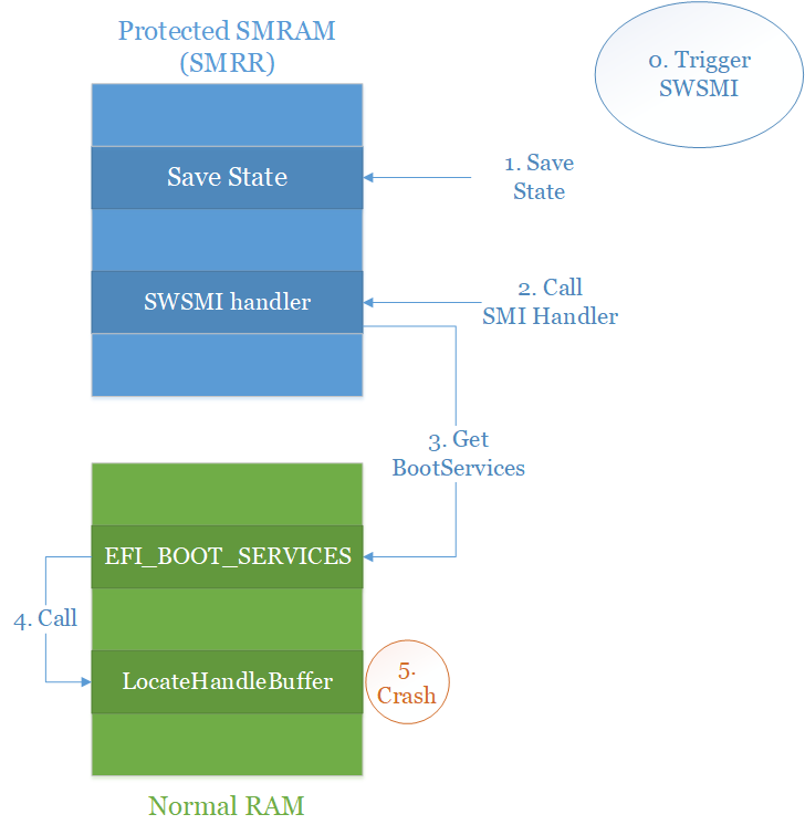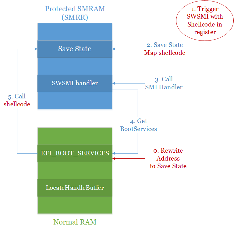 从SMM调用此函数的问题在于,EFI_BOOT_SERVICES 是位于正常环境中的服务表。攻击者可以简单地更改EFI_BOOT_SERVICES表中的地址并获得任意调用。这种类型的漏洞通常称为SMRAM调用,它们基本上等效于从内核调用用户级代码。