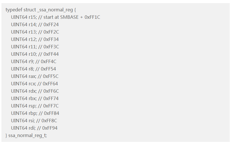 基本思想是受益于保存状态,该状态由CPU在切换到SMM时设置。保存状态始终位于SMBASE + 0xFC00并且包含许多通用寄存器,使我们能够控制(在最佳情况下)0x80内存字节: