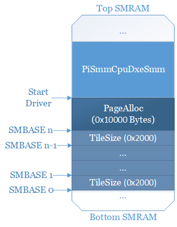 将SMBASE在初始化PiSmmCpuDxeSMM驱动程序,该驱动程序是开源和edk2可用。初始化SMBASE第一件事情时,它计算要保留的大小。因为SMBASE每个CPU 需要一个内存,因此不足以保留0x10000,但是为了优化RAM空间,驱动程序避免了每个CPU保留那么多内存。TileSize在驱动程序中计算A 来确定应移动SMBASE多少,而实际上在驱动程序中进行动态计算时,总是将其偏移0x2000字节。现在我们知道了SMBASE相互比较的位置,并且 0x10000 + TileSize * (number_of_cpu - 1)将保留内存字节。