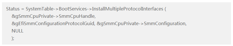 1.使用该EFI_BOOT_SERVICES.LocateProtocol函数检索EfiSmmConfigurationProtocol。