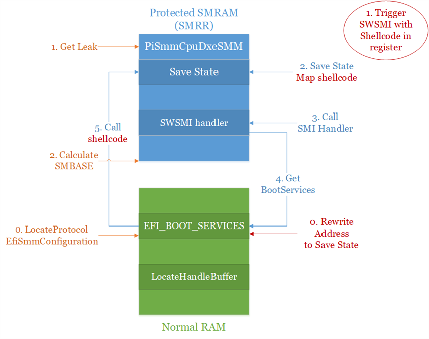 最后,由UEFI固件初始化在SMM中运行的代码(SMRAM中的设置)。特别是,通常在UEFI引导的驱动程序执行环境(DXE)阶段设置SWSMI处理程序。DXE阶段由数百个驱动程序组成,这些驱动程序用于从硬件初始化到网络堆栈实施的所有过程。