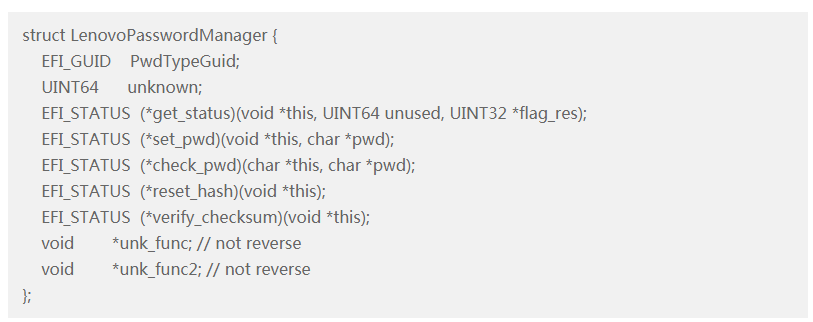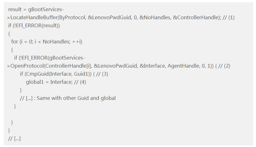 这段代码不搜索一个协议,而是搜索其中的几个协议,所有协议都具有相同的GUID LenovoPwdGuid(2846b2a8-77c8-4432-86ec-199f205d37ca)(1)。它正在检索每个接口的接口(2),并将接口的开头与硬编码的GUID(Guid1在这种情况下)进行比较(3)。根据GUID,使用相应的全局变量来存储该接口(4)。这样设置了四个不同的全局变量。