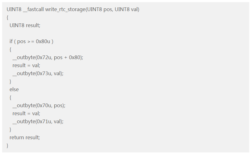 第一个参数(this)只是协议接口上的指针,最后一个参数(pRes)显然用于检索读取的值,另外两个参数清楚地指示要使用的存储空间。在index这个存储空间的偏移,但unk_enum还不清楚。与NOR或NAND闪存相反,Eeprom在擦除大小上可以具有良好的粒度。但是,由于用于处理小尺寸擦除的电路占用了空间,可用于更多存储,因此擦除通常是在“存储体”中重新分组的几个字节上进行的。实际上,这意味着编程接口实际上与NOR或NAND闪存非常相似。这是大多数eeprom被更便宜的NOR或NAND闪存取代的原因之一。在我们的情况下unk_enum实际上是在模拟的eeprom中的一个库号,在代码中将该库号翻译并添加到该index编号中,以计算读取或写入时的偏移量。