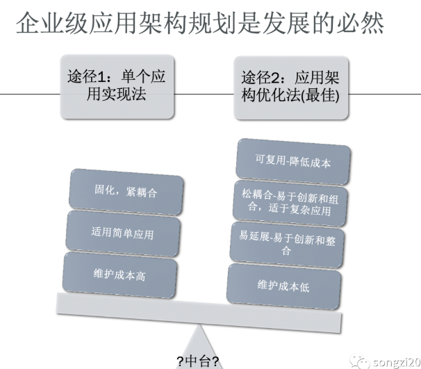 单个应用的实现。Case by Case的考虑,通过一个规划的IT应用来满足响应的业务功能。这种方式简单明了可以快速实现,纯属堆积。随着业务复杂度提升、业务变革速度加快,需求实现难度与后期维护成本显著加大。