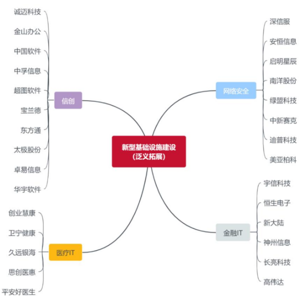 泛义的新基建:信创、网络安全、医疗IT、金融IT等。
