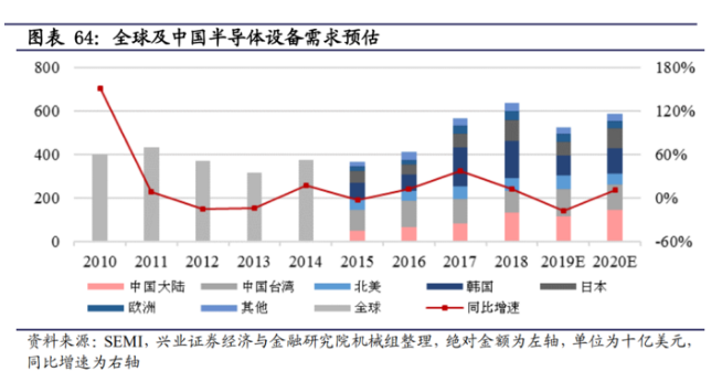 半导体设备产能向大陆转移释放庞大需求,反弹动能更大。据SEMI数据,2018年中国大陆半导体设备销售额为131.1亿美元,同比增加59.30%,市场规模首次超越中国台湾地区位居全球第二,增速全球居首。