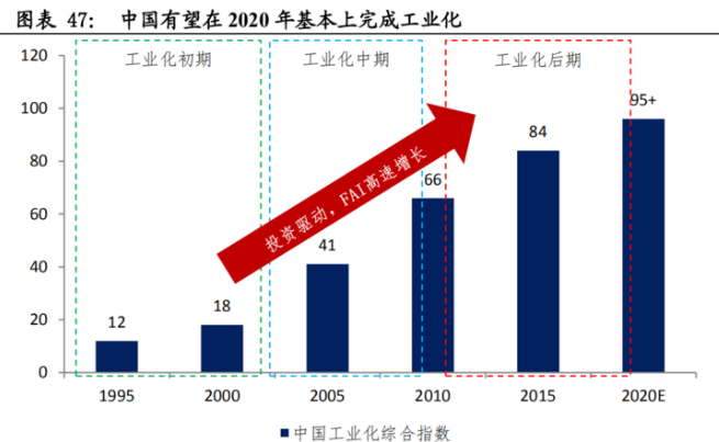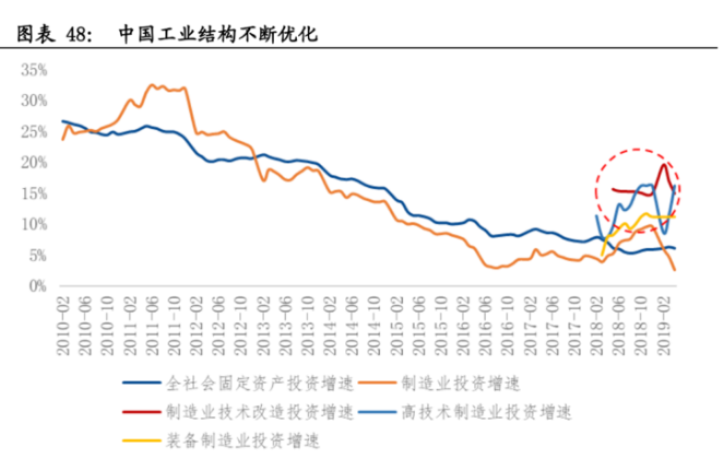 中国将迈入后工业化时代,工业结构不断优化,高端制造产业投资占比将不断提升。目前中国已进入到工业化后期向后工业化时代过渡的阶段,全社会固定资产投资增速放缓,中国经济发展已经由要素驱动、投资驱动向创新驱动转变,带来中国工业结构不断优化。2019年之后,制造业投资增速回落,1-4月份制造业投资同比增长2.5%,增速比一季度回落2.1个百分点。制造业投资增速虽有所回落,但高技术制造业投资和制造业技术改造投资分别增长11.4%和14.9%,高于全部制造业投资8.9个百分点和12.4个百分点,高端制造业占比将持续提升。