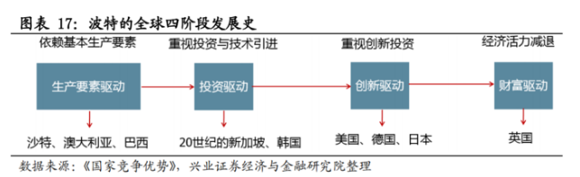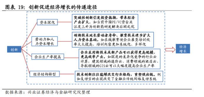 波特在其《国家竞争优势》中指出,每一个国家的发展将经历生产要素驱动、投资驱动、创新驱动和财富驱动等四个发展阶段。1981-2017年间,中国主要是由地产、传统基建为代表的投资驱动发展。然而,近年来GDP增速呈下行趋势,呈现出明显的L型。2019年,中国GDP达到99.09万亿元,同比增速为6.10%,同比下降0.6个百分点。在经济增长趋缓的背景下,我国经济发展将踏上由投资驱动转向创新驱动的转型之路。基于《突破性创新与经济增长》报告给出的分析框架,创新可以通过资本深化、推动人力资本增长、提高企业生产效率与促进经济结构转型四大途径来促进经济增长,中国将迈入“大创新时代”。