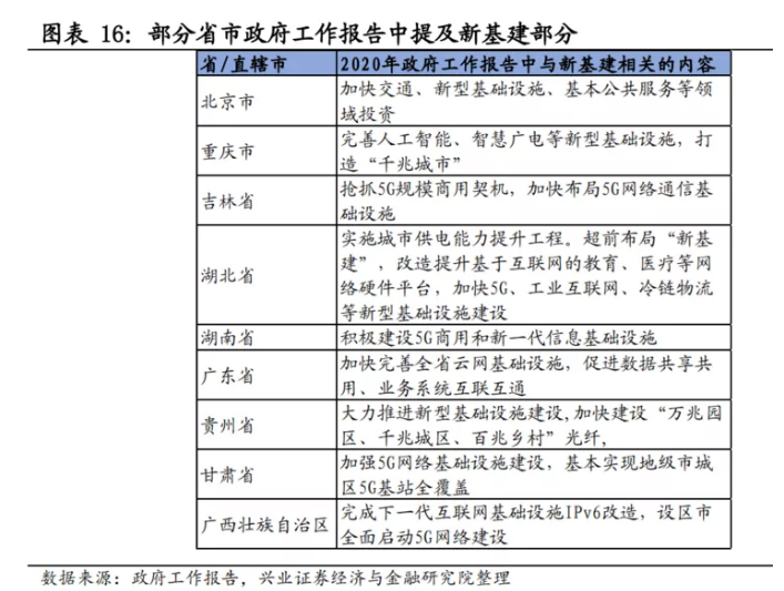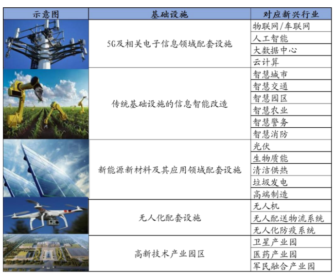 《报告》认为新基建主要是两个概念:1)狭义的新基建:科技产业升级为核心的基础设施建设,包括5G基站、工业互联网、物联网、车联网、医疗信息等建设,这部分项目有典型的高技术、中长期高回报的特点;