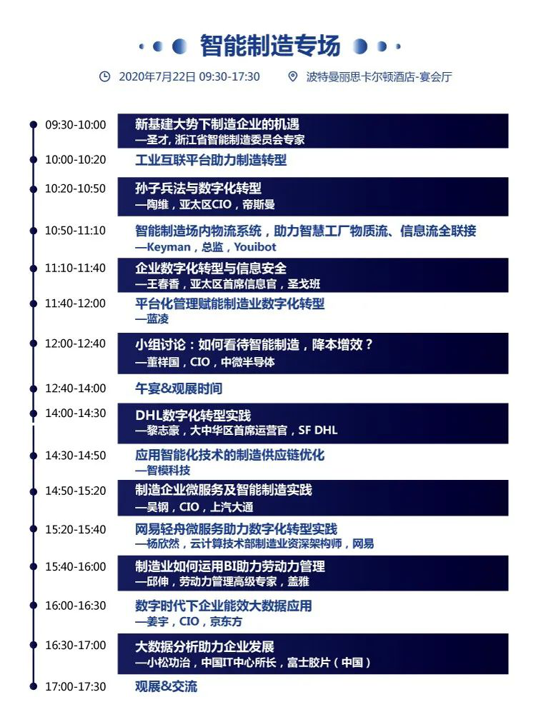 此次CDIE专设智能制造论坛,将聚焦制造行业智能化,数字化转型,探讨传统行业如何才能迅速实现信息化转型?制造企业微服务及智能制造实践等话题。