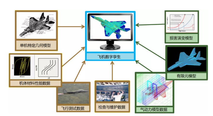 波音公司为F-15C型飞机创建了数字孪生体,不同工况条件、不同场景的模型都可以在数字孪生体上加载,每个阶段、每个环节都可以衍生出一个或多个不同的数字孪生体,从而对飞机进行全生命周期各项活动的仿真分析、评估和决策,让物理产品获得更好的可制造性、装配性、检测性和保障性,如下图所示。