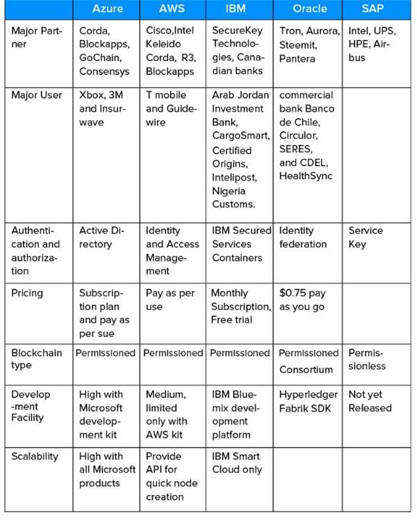 BaaS市场的顶级玩家必然是那些在云服务领域站稳脚跟多年的人。这些是最大的信息和通信技术集团,它们正步步紧逼,以夺取B2B消费者的最大份额。我们将在对他们的服务进行对比时提出我们的逻辑,让读者自己决定谁是最好的。充分利用区块链服务提供商的小型可行性研究。
