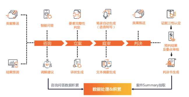 AI智能语音系统结合对庭审和办公应用场景的定制,可以在咨询、立案、庭审、判决四个环节都在帮助法官。
