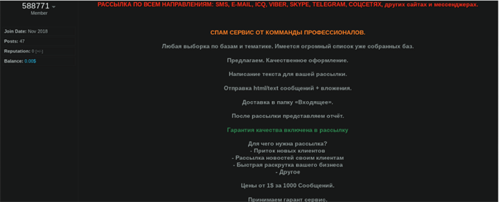 588771:是一个俄语犯罪组织,他们专门提供针对SMS、电子邮件、Skype、Telegram和社交网络的专业垃圾邮件服务。据悉,588771组织的服务价格已经从最初的1,000条SMS消息/美元起,飙升到了现在的10,000条SMS消息1,000美元,有英语和俄语两种版本。