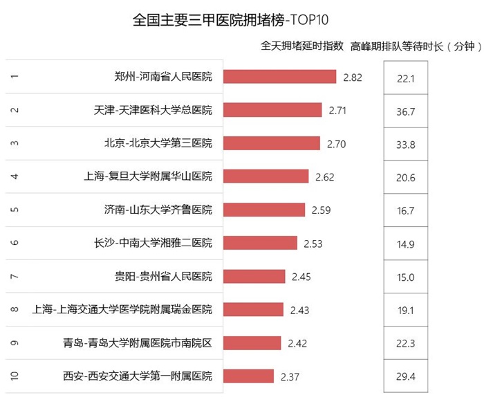 榜单前五名分别是:郑州河南省人民医院,天津医科大学总医院、北京大学第三医院、上海复旦大学附属华山医院、济南山东大学齐鲁医院,高峰期排队时长均在16分钟以上。