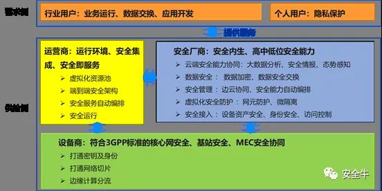 以5G安全为例,5G产业链上至少包括4方角色,不仅有网络安全厂商和用户(行业用户、个人用户),还包括设备商(华为、中兴、大唐、爱立信、诺基亚)、运营商(电信、移动、联通、广电)等等,而5G安全需要各方的共同参与,如下图所示: