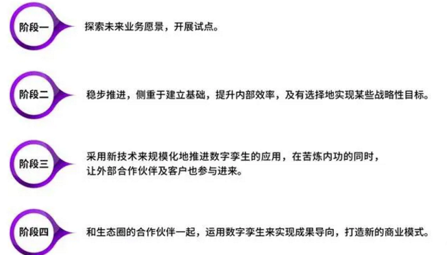 数字孪生应用是IT/OT融合的典型应用,要实现虚实映射,需要搭建工业互联网平台,明确应用对象的重点是企业生产的产品、工厂、供应链;面向产品的数字孪生应用重点是支持产品研发、市场推广还是运营维护;面向工厂的数字孪生应用重点是工厂或产线建设期间的虚拟调试,还是工厂运营阶段的可视化与优化。推进数字孪生需要制定整体规划,合理把控风险,结合具体目标,分步实施,不能搞“大而全”的应用。埃森哲《数字孪生:打造生力产品,重塑客户体验》白皮书提出了推进数字孪生应用的四个阶段: