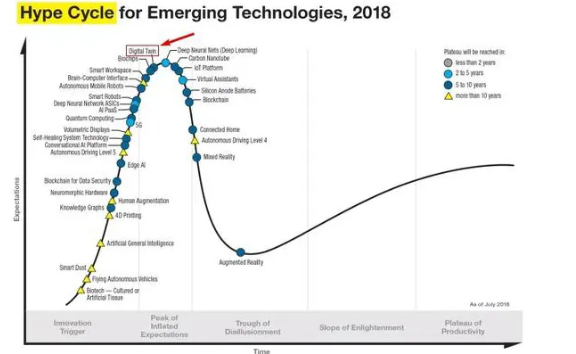 (从2018年Gartner发布的新兴技术成熟度曲线中可以看出,数字孪生已经进入了过热期,其建设和预期出现了高峰,超出其当前能力,会形成投资泡沫)
