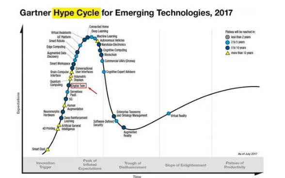 (在Gartner2017年发布的新兴技术成熟度曲线中,数字孪生处于创新萌发期,距离成熟应用还有5-10年时间)