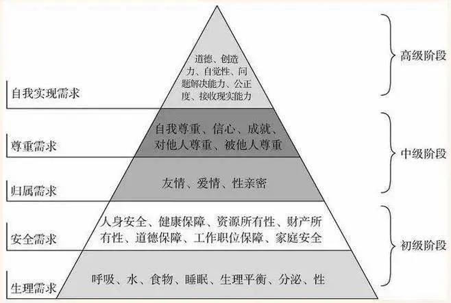 马斯洛需求层次分为三个阶段,初级阶段包括处于底层的生理需求:比如呼吸、水、食物、睡眠、生理平衡、分泌、性等;和第二层的安全需求:比如人身安全、健康保障、资源所有性、财产所有性、道德保障、工作职位保障、家庭安全等。中级阶段包括第三层的归属需求:比如爱情、友情、性亲密等;还有第四层的尊重需求:比如自我尊重、信心、成就、对他人尊重、被他人尊重。高级阶段包括第五层自我实现:比如道德、创造力、自觉性、问题解决能力、公正度、接受现实能力等。