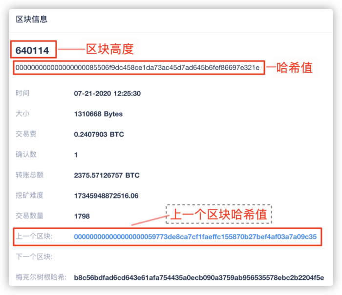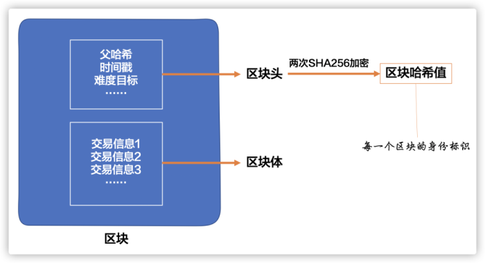 每一个区块由区块头和区块体构成。区块头由父哈希(上一个区块的哈希值)、时间戳、难度目标等信息构成,区块体由交易记录和其他信息构成。区块头经过两次SHA256加密算法得到区块哈希值,哈希值是区块的身份标识符,与身份证号码类似,具有唯一性。严格来说,区块哈希值并不包含在区块结构内。