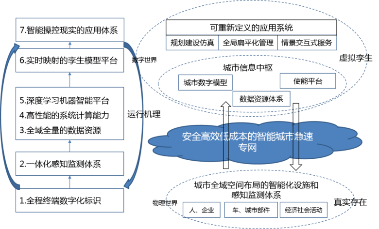 数字孪生城市的本质是城市级数据闭环赋能体系,通过数据全域标识、状态精准感知、数据实时分析、模型科学决策、智能精准执行,实现城市的模拟、监控、诊断、预测和控制,解决城市规划、设计、建设、管理、服务闭环过程中的复杂性和不确定性问题,全面提高城市物质资源、智力资源、信息资源配置效率和运转状态,实现智慧城市的内生发展动力。