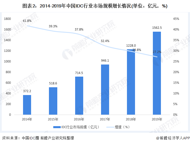 受“互联网+”、大数据战略、数字经济等国家政策指引以及移动互联网快速发展的驱动,我国IDC业务收入连续高速增长。数据显示,2018年,我国IDC行业市场规模达1228亿元,同比增长29.8%;2019年,据中国IDC圈测算,我国IDC行业市场规模达1562.5亿元,同比增长27.2%。