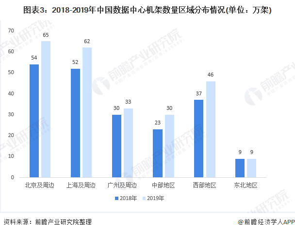 我国IDC的地域集中性和中国网络拓扑结构密切相关,目前,我国核心IDC资源集中在江浙沪地区,整体上架率约达到90%以上,未来主要IDC资源扩张地区主要位于北京、深圳、江苏等核心城市,以及内蒙古、河北等非核心城市。从全国数据中心的机架分布来看,2019年,北京、上海和西部地区的数据中心机架数量排名前三,分别达65万架、62万架和46万架,均实现增长。