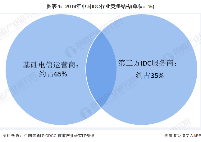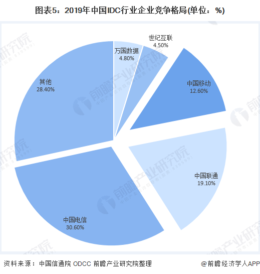 具体来看,2019年,我国IDC企业竞争格局中,中国电信、中国联通、中国移动的市场份额占比位列前三,分别为30.6%、19.1%和12.6%;其次是属于第三方IDC服务商的万国数据和世纪互联,其市场份额占比分别为4.8%和4.5%。