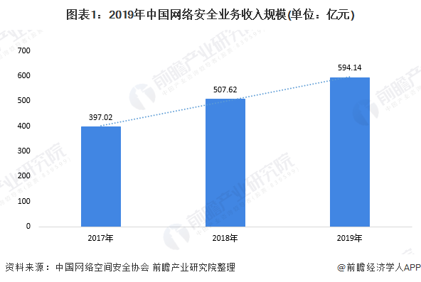 近年来,在市场需求和政策引导的共同推动下,我国网络安全行业迎来了较好的发展机遇。2019年,我国网络安全业务实现收入594.14亿元,同比增长17%。