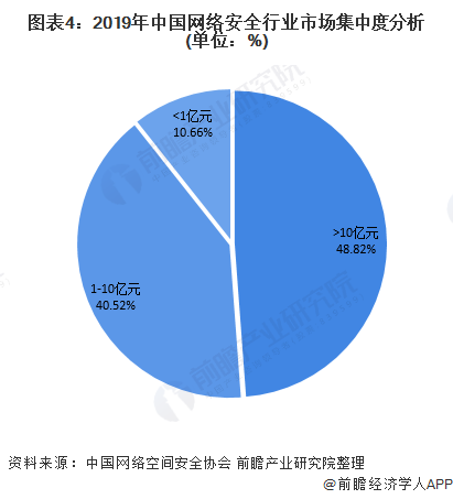 近年来,随着市场竞争进一步加剧,网络安全行业的市场集中度有所提升。据中国网络空间安全协会统计,2019年,我国有13家企业网络安全业务年收入超过10亿元,占网络安全业务总收入的48.82%;收入1亿元在以上的共94家,占比40.52%;收入1亿元以下的近400家,占比10.66%。
