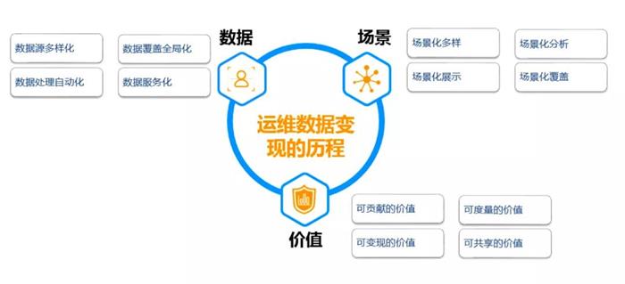 在初级阶段,运维数据来源局限于运维侧自身,如资源数据、监控数据、文本数据、日志数据,随着数据源接入进入全覆盖的时候,运维数据已经覆盖业务运营数据、后台支撑数据、财务数据。需要说明的是,运维数据的获取离不开运维数据输出的强依赖条件,那就是场景输出的需要,一切数据的根本都要基于运维能力输出。
