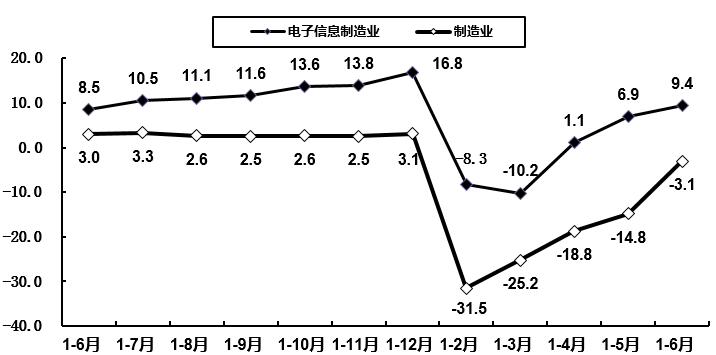 1-6月,规模以上电子信息制造业增加值同比增长5.7%,增速比去年同期回落3.9个百分点。6月份,规模以上电子信息制造业增加值同比增长12.6%,增速同比增长2.2个百分点。