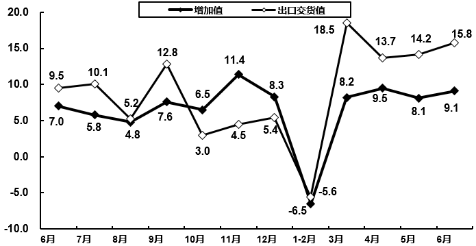 图1 2020年6月电子信息制造业增加值和出口交货值分月增速(%)