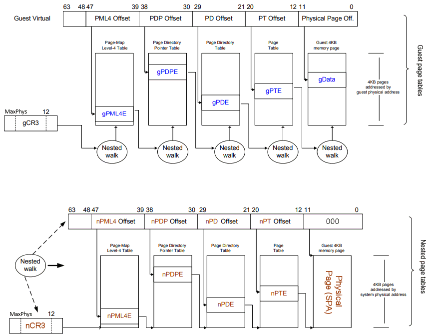 下图展示了从GPA到SPA的X64第二阶段物理地址转换。