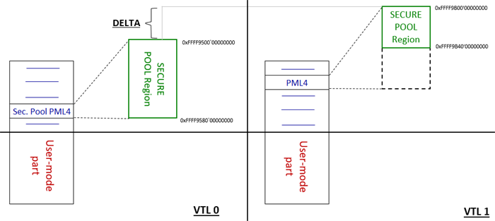 安全内核会创建一个NAR,表示属于不安全NT内核的整个512GB虚拟区域,并初始化属于NAR的所有相对NTE。安全内核中的安全池虚拟地址空间为256GB,这意味着映射它的PML4会与其他一些内容共享,并且与NT相比不在同一个基址上。因此,在初始化安全池描述符时,安全内核还会计算一个Delta值,该Delta值是安全内核中安全池基址与NT内核中保留池基址之间的差(如下图所示)。这非常关键,因为它允许安全内核向NT内核指定将属于安全池的物理页面映射到的位置。