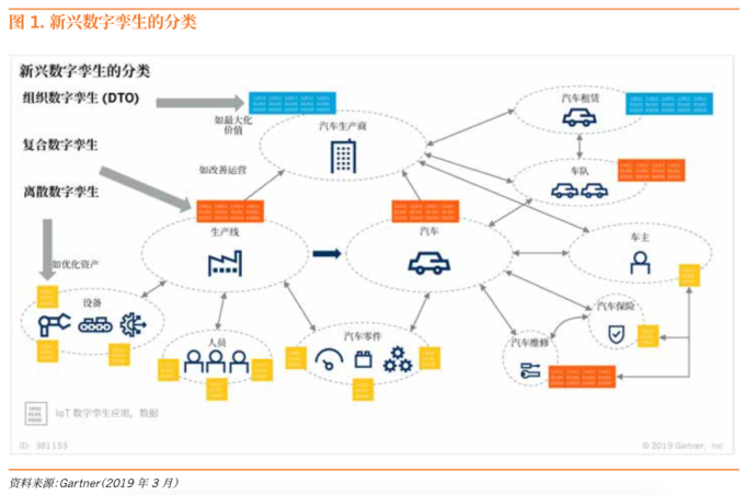 2.复合数字孪生:应用于涉及包含离散数字孪生和资源(例如,来自外部数据源)的运作。通常设计用于监控和优化离散数字孪生和原子资源的相关组合的使用。例如,复合性更高的设备,比如汽车或工业汽轮机,以及整个和部分制造或工业流程。