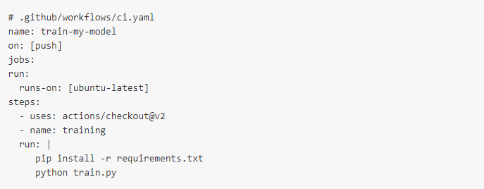 如果这个文件在你的项目repo中,每当GitHub检测到对你的代码的更改(通过push注册),GitHub Actions就会部署一个Ubuntu运行程序,并尝试执行你的命令来安装需求并运行Python脚本。请注意,你必须在项目repo中包含你的工作流所需的文件——这里是requirementes .txt和train.py。