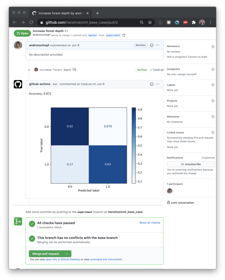 为了制作这个报告,我们的GitHub操作执行了一个Python模型训练脚本,然后使用CML函数将我们的模型准确性和混淆矩阵写入一个markdown文档。然后CML将减价文档传递给GitHub。