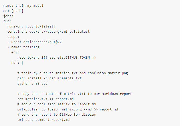 你可以在这里看到整个项目存储库。注意,我们的.yaml现在包含更多的配置细节,比如一个特殊的Docker容器和一个环境变量,以及一些要运行的新代码。容器和环境变量细节在每个CML项目中都是标准的,而不是用户需要操作的东西,所以请关注代码。