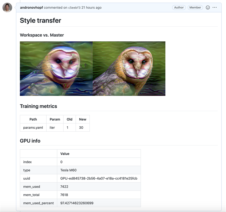 例如,我做了一个使用GitHub Actions部署EC2 GPU的项目,然后训练一个神经类型的传输模型。以下是我的CML报告: